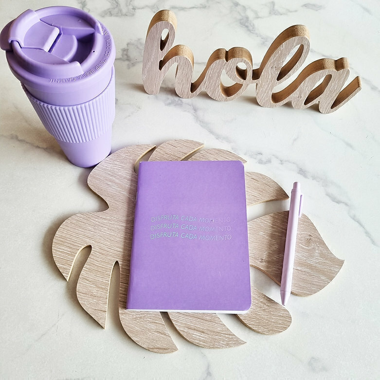 - Libreta color pastel con tapa blanda, estampadas con frases en color plateado